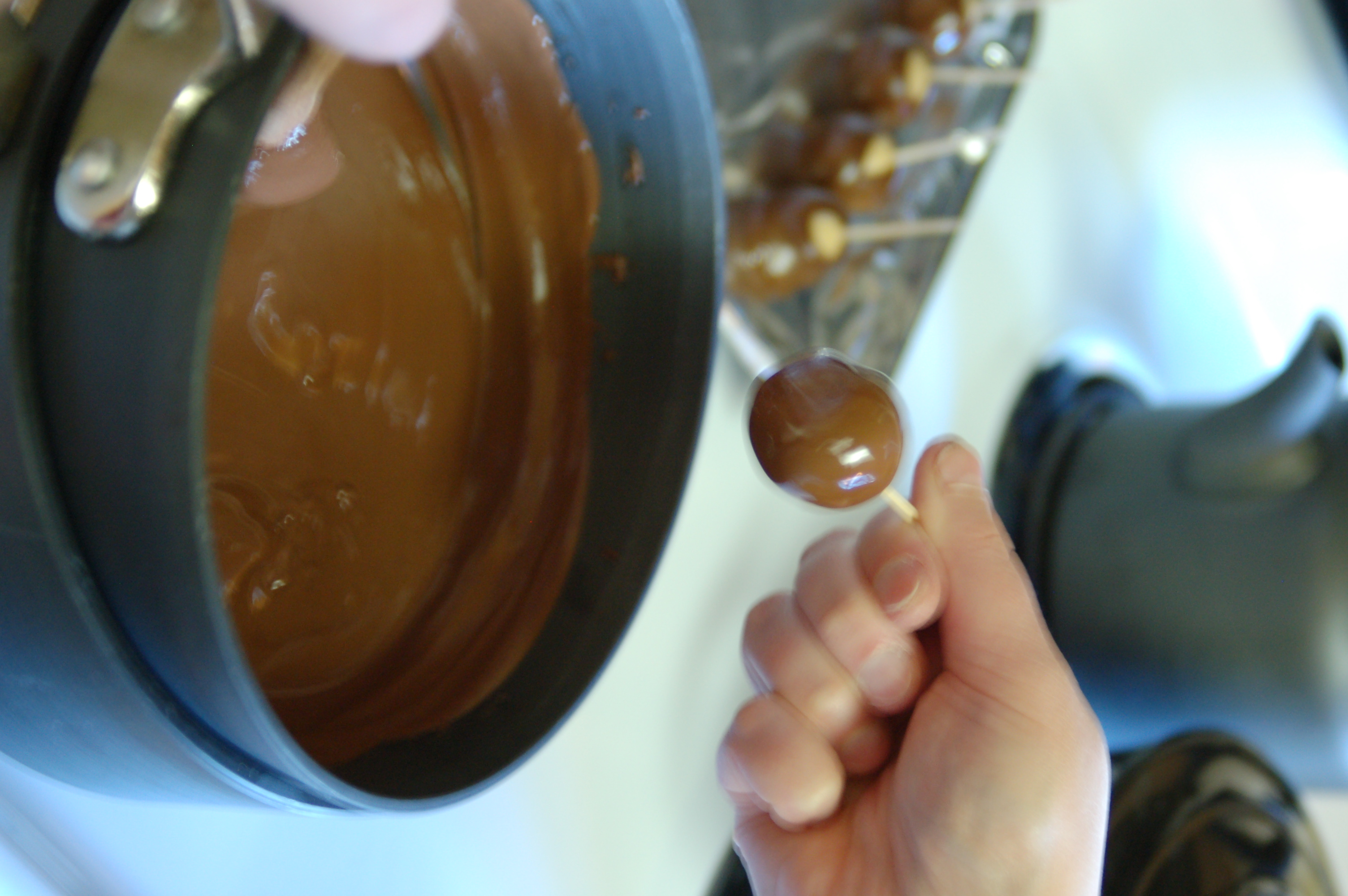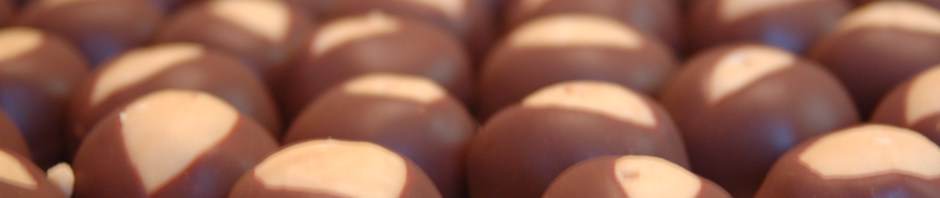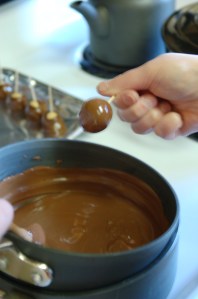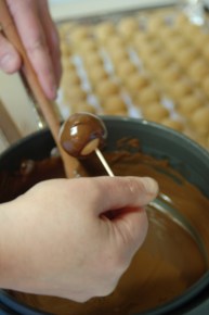 While you’re melting your chocolate, your peanut butter balls should be chilling on waxed paper in your freezer. This will reduce the liklihood that your balls will fall off the toothpick as you are dipping them in the chocolate. If they are too soft, you’ll end up fishing every one of them out of the pan and they won’t look like Buckeyes, they’ll just look like chocolate balls. Enjoy your Buckeyes but always Hail to the Victors! Go Blue!