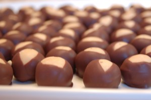 Mix all ingredients together in a large bowl (you’ll need to use your hands). Roll into balls 1/2 in – 1 in. Place on waxed paper lined cookie sheet and place in freezer to chill. Meanwhile, melt 1 12oz bag of semi-sweet chocolate chips with 1/4 block of paraffin wax (cut into small pieces) over double boiler. Using a toothpick, dip balls in chocolate and place on waxed paper. Return to refrigerator or freezer to harden.