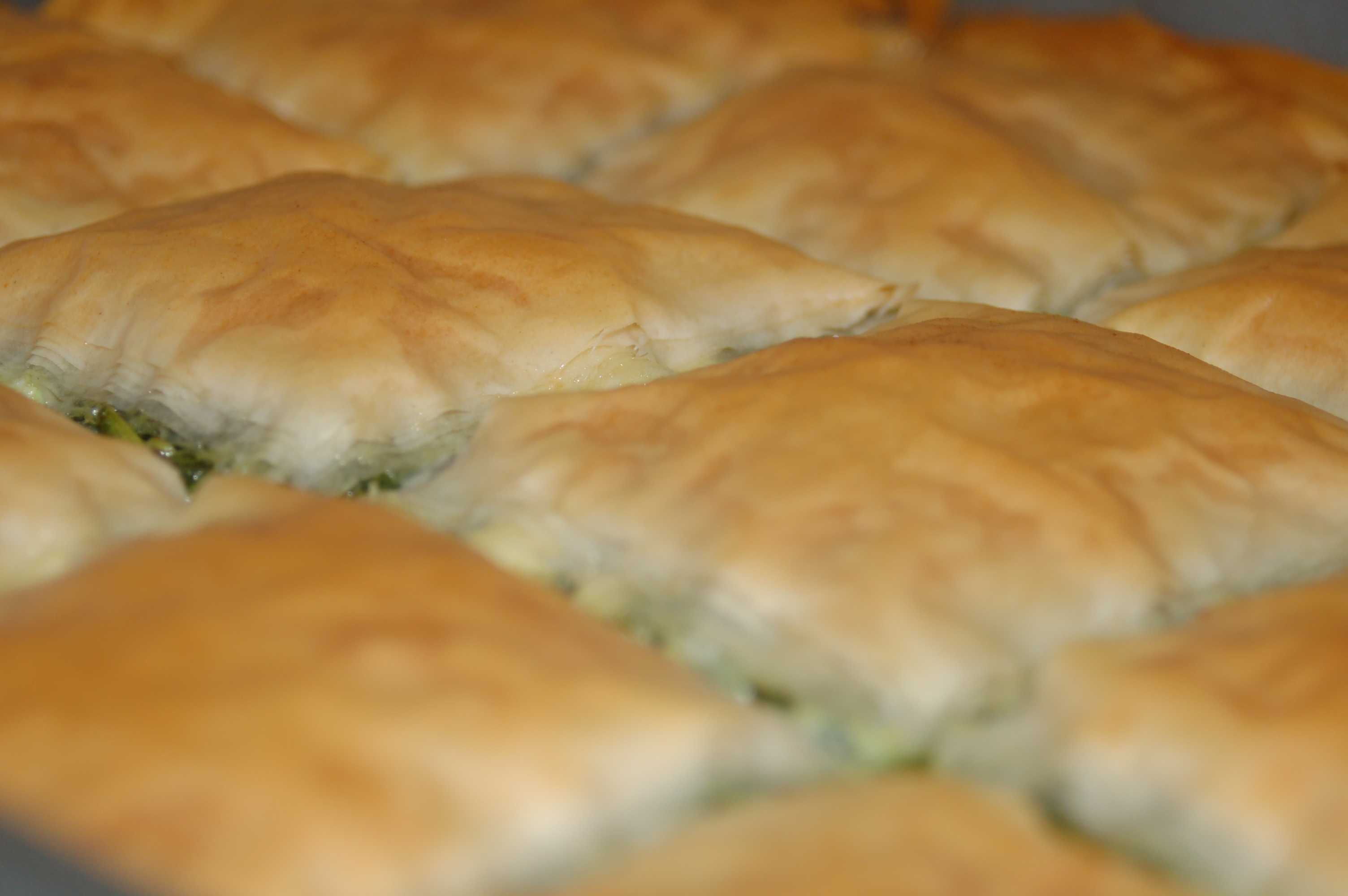 I first learned how to make Spanakopita from watching my sister, Angela, in her kitchen. She would whip it up with ease as if she was on autopilot. I would take mental notes of her ingredients and eventually began to make it on my own. Over the years, I have developed my own recipe; taking bits and pieces from different recipes I’ve tried in the past. The phyllo dough in this recipe is prepared similarly to that of Baklava except that instead of alternating the phyllo dough and filling like you do in Baklava, you place all the spinach filling in the center between a bottom layer of 1/2 lb of phyllo (approximately 8 sheets) and a top layer of 1/2 lb of phyllo (approximately 8 sheets), buttering between each layer. This process is slightly less labor intensive than Baklava unless you decide to make individual Spanakopita Triangles. These are fun to make but take a little more time and effort. This involves cutting your phyllo dough into strips, placing a small portion of the filling at one end and folding your dough up into a triangle shape, back and forth while buttering each folded layer. The triangles are easy to freeze and can be thawed quickly for individual servings. Spanakopita can be eaten warm, cold or at room temperature but I think it’s best at room temperature. If you love spinach and feta, I encourage you to give Spanakopita a try.