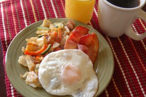Both of these recipes are new ones for me.  They’re perfect for a weekend brunch and are pretty enough for entertaining.  I modified the Potato and Zucchini Hash recipe slightly to add a little more color with red bell pepper.  I also added bacon to the dish which shouldn’t be a surprise if you’ve read To Love, Honor and Cherish.  Everything is better with bacon!  Upon a suggestion from my daughter, Julia, this was the first time I have ever cooked bacon in the oven and it has now become my preferred method (Sorry, Grandma).  By placing a cooling rack on top of a jelly roll pan, the fat is able to drip off the bacon leaving it perfectly cooked, not too chewy and not too crisp.  I rarely make muffins from scratch but these are definitely a winner and will remain in my recipe file for my next brunch menu.  I urge you to shoo the kids out of the kitchen; pull out a game or pop in a movie to keep them busy and try these delicious recipes for a quick and easy brunch on the weekend.