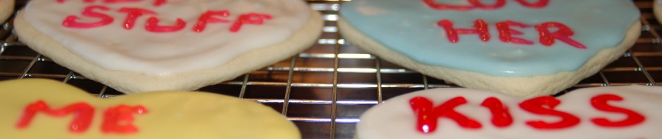 I planned the perfect 1st birthday party for Syd.  We invited all the families from our playgroup and I prepared a table full of delicious food perfect for entertaining.  With Syd’s birthday being so close to Valentine’s Day on February 9th, I baked a batch of frosted sugar cookies and decorated them as Sweethearts Conversation Hearts.  These cookies were dessert for all my guests since I had baked Sydney her very own cake, just for her.