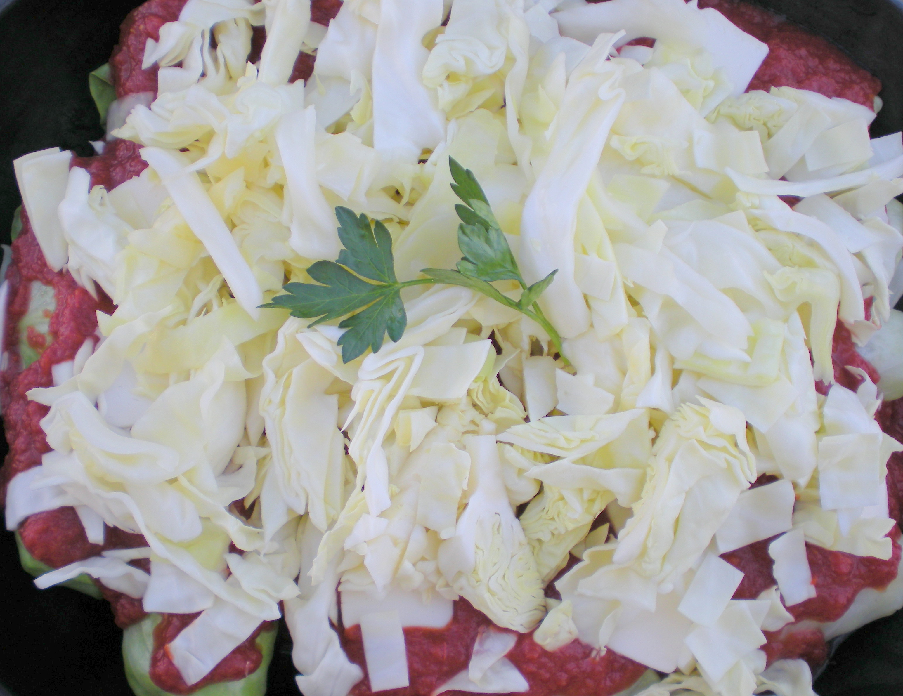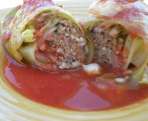 Fill each individual cabbage leaf with approximately 2 Tbs. of meat filling. The larger leaves will need about 3 Tbs. of filling. Begin at bottom core of leaf, turn both sides in and roll up. Place in baking dish with the seam side down. Pour crushed tomatoes over cabbage rolls and top with remaining chopped cabbage. Pour approximately 1 ¼ c. water around edges of baking dish to create moisture and steam for rice to cook through. Cover with foil and bake for 1 hour at 375°.