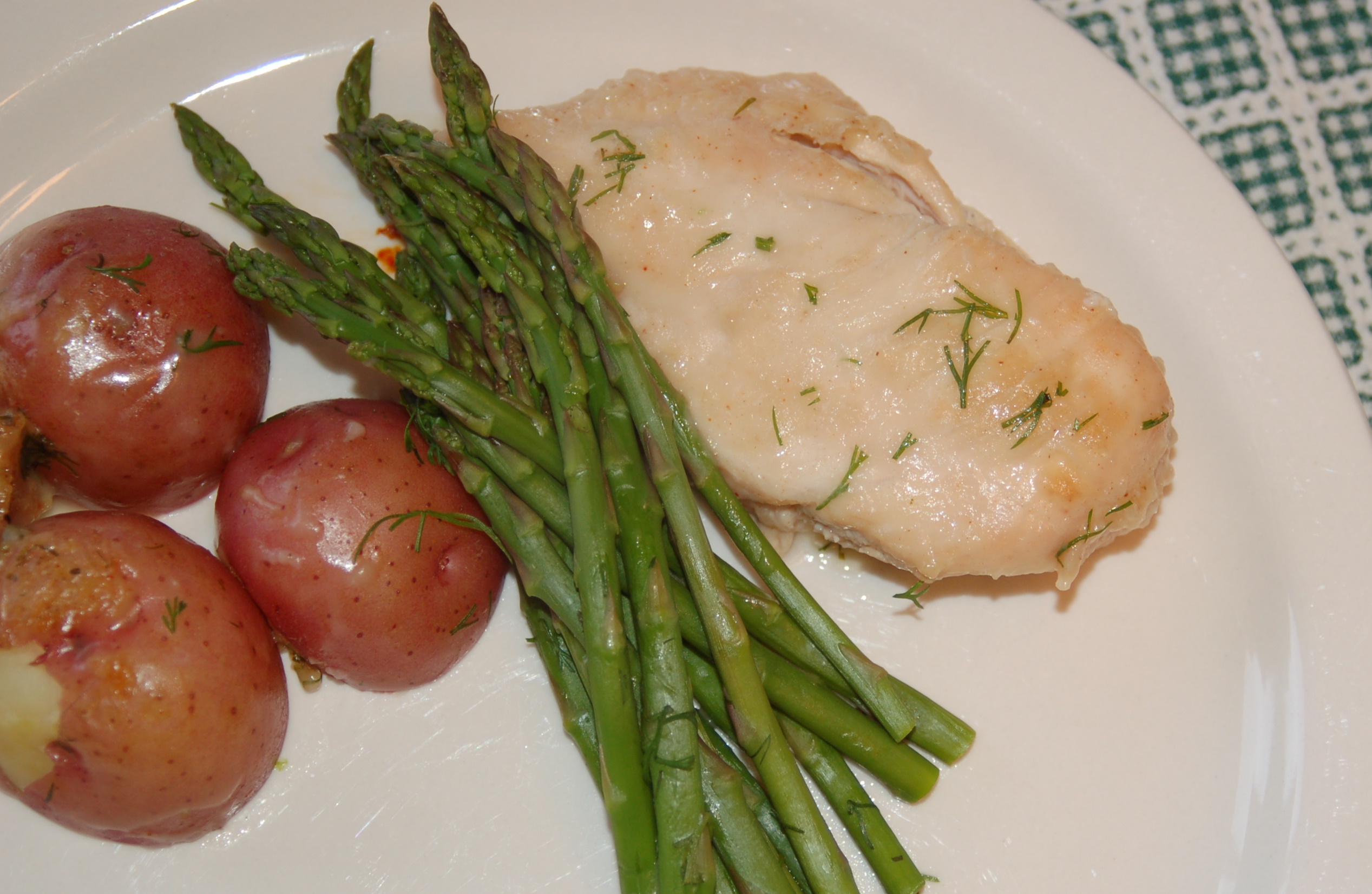 While you still have too much on your plate, this recipe can help you out. It’s a delicious one pot meal made with chicken, new potatoes, dill, and asparagus bringing so much flavor and depth to a week night family dinner. Ready in under an hour (there really are no 30 minute meals, Rachael Ray), Dilled Chicken Fricassée comes from one of my favorite cookbooks, The Woman’s Day Cookbook, and page 55 has proof that this is one of my most frequented recipes. Fricassée is a catch-all term used to describe a stewed dish typically made with poultry, but other types of white meat can be substituted. It is cut into pieces and then stewed in gravy, which is then thickened with butter and cream or milk. It often includes vegetables as well. Greek fricassée is often made with pork and usually contains either wild green herbs and the gravy is thickened with beaten eggs just before serving. The recipe calls for bone-in chicken breasts but I use boneless breasts which cuts the cooking time a little. The combination of fresh dill, lemon and asparagus is really what makes this dish so tasty. My daughter, Julia, and I both love asparagus so I usually add two bunches instead of just one. We pay for it later but I hear this is common and normal based on research.