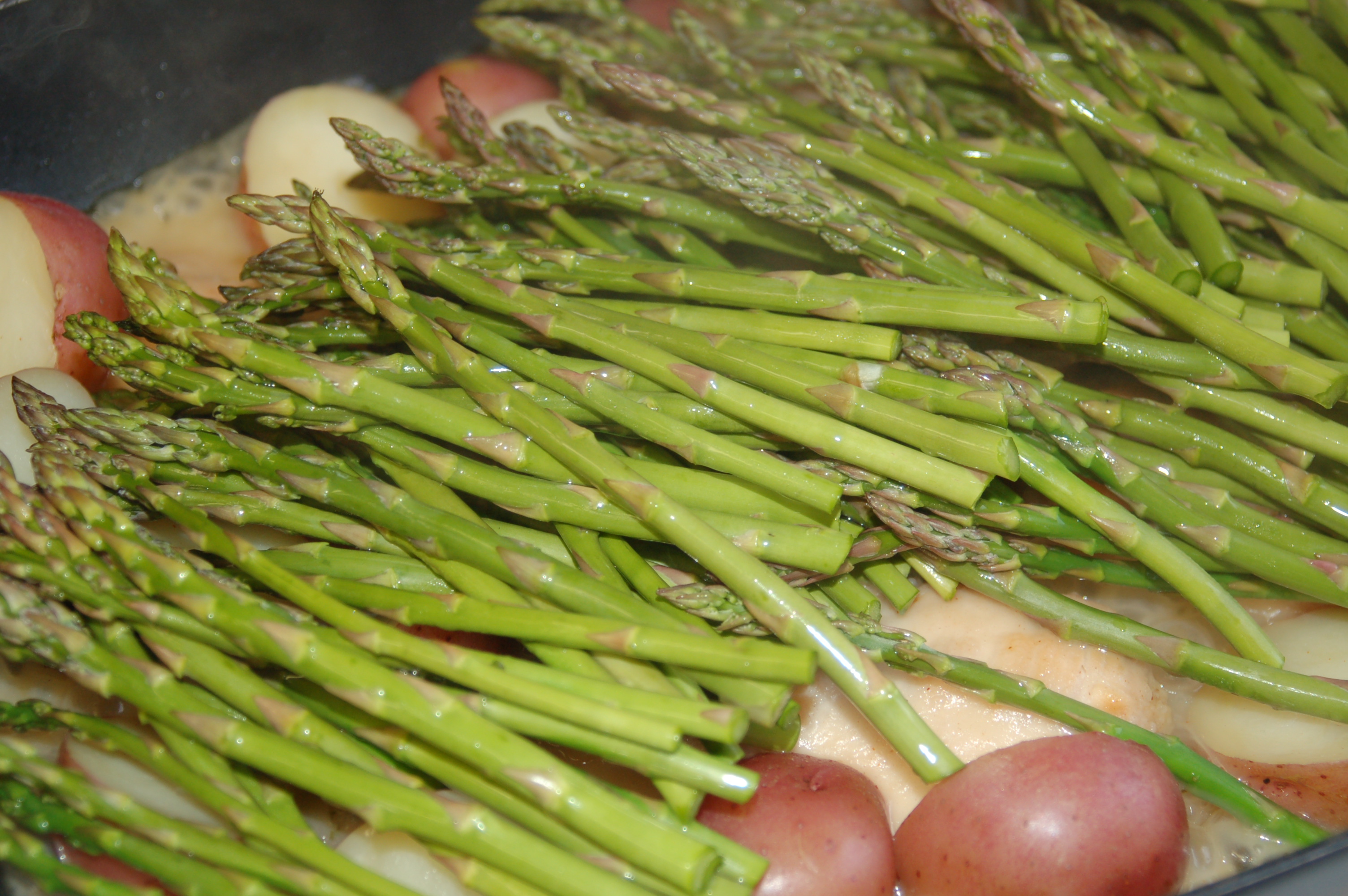 5.) Lay the asparagus over the top. Cover and simmer for 15 to 20 minutes more, or until the chicken and vegetables are tender.