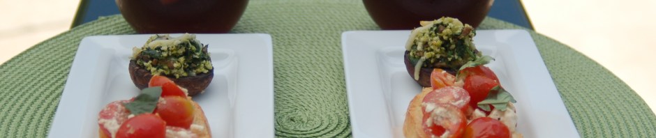Stuffed Mushrooms with Spinach; and Grilled Scallops wrapped in Proscuitto. All three were very simple to pull together for an afternoon with a girlfriend. The mushrooms can even be stuffed in advance and baked just before serving. This was the first time I have ever grilled scallops and they were delicous. Whole Foods had fresh scallops in their seafood department that were enormous so I decided to go with the smaller, pre-packaged, frozen scallops. It was an excellent choice because they were a little easier to work with when wrapping and skewering. Eating light never tasted so good. Forget the fact that I ate about 5 of each. 🙂 My only mistake here was that I should have invited more friends!